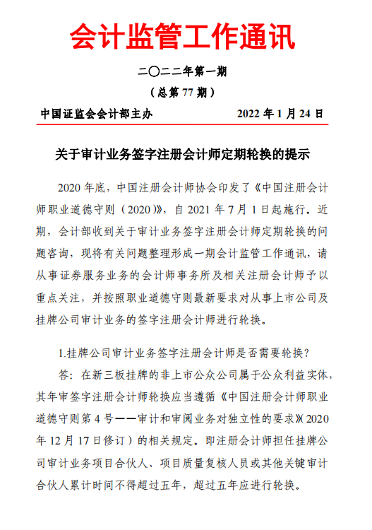 2020 年底,中国注册会计师协会印发了《中国注册会计 师职业道德守则(2020)》,自 2021 年 7 月 1 日起施行。近 期,会计部收到关于审计业务签字注册会计师定期轮换的问 题咨询,现将有关问题整理形成一期会计监管工作通讯,请从事证券服务业务的会计师事务所及相关注册会计师予以 重点关注,并按照职业道德守则最新要求对从事上市公司及 挂牌公司审计业务的签字注册会计师进行轮换。