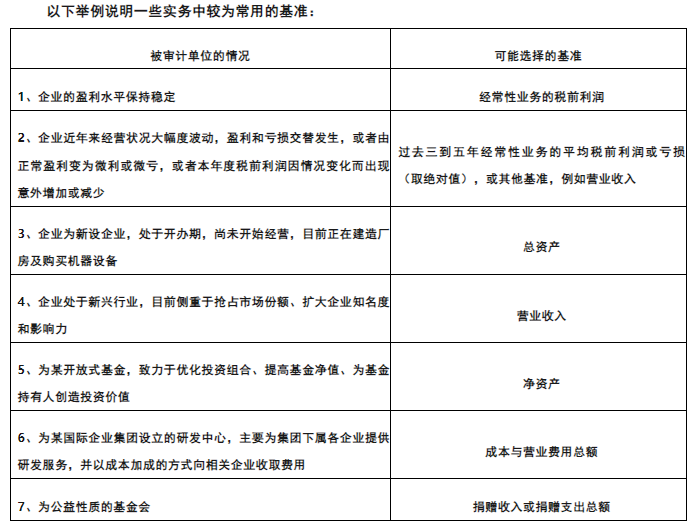 注册会计师为被审计单位选择的基准在各年度中通常会保持稳定,但是并非必须保持一贯不变。注册会计师可以根据经济形势、行业状况和被审计单位具体情况的变化对采用的基准作出调整。例如,对于处在新设立阶段的被审计单位可能采用总资产作为基准,对于处在成长期的被审计单位可能采用营业收入作为基准,对于进入经营成熟期的被审计单位可能采用经常性业务的税前利润作为基准。