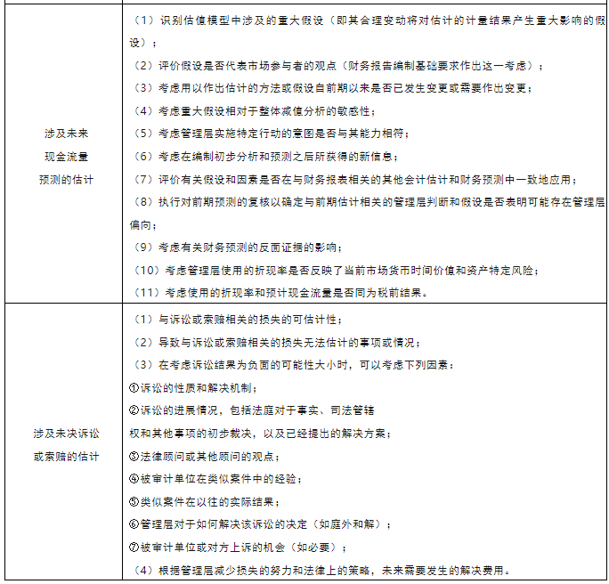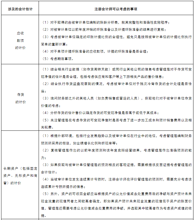 答:根据适用的财务报告编制基础的规定,不同被审计单位面临的需要作出会计估计的情形可能各有不同,下表列举了常见的会计估计的例子以及针对每一种会计估计,注册会计师可以考虑的事项。下表并非注册会计师可以考虑事项的全部,仅为注册会计师的执业提供参考。