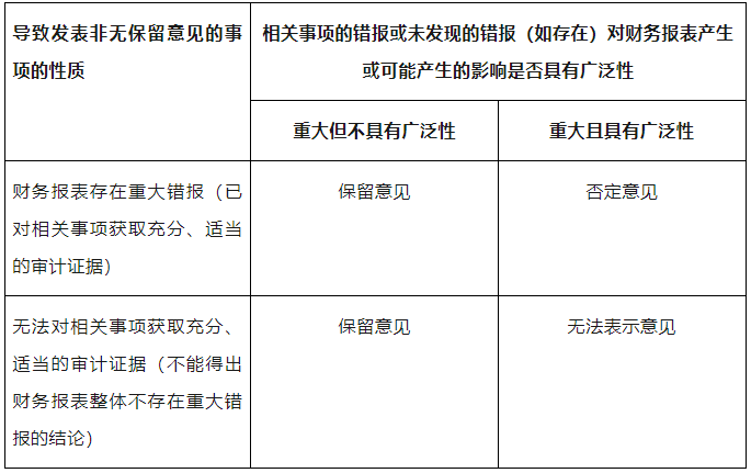 首先,导致注册会计师发表非无保留意见的事项单独或汇总起来对财务报表的影响或可能产生的影响一定是重大的。在这个前提下,注册会计师应当发表保留意见,还是否定意见或无法表示意见,取决于导致非无保留意见的事项(即财务报表存在重大错报;或注册会计师无法获取充分、适当的审计证据,财务报表可能存在重大错报)对财务报表整体产生的影响或可能产生的影响是否具有广泛性:如果不具有广泛性,注册会计师应当发表保留意见;如果具有广泛性,则应当发表否定意见或无法表示意见。针对上述应当发表否定意见或无法表示意见的情形,注册会计师发表否定意见,还是无法表示意见,取决于注册会计师是否已对导致非无保留意见的事项获取充分、适当的审计证据:如果已获取充分、适当的审计证据,注册会计师应当发表否定意见;如果无法获取充分、适当的审计证据,注册会计师应当发表无法表示意见。