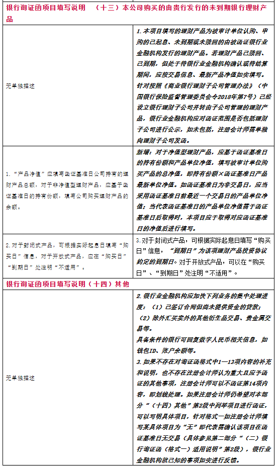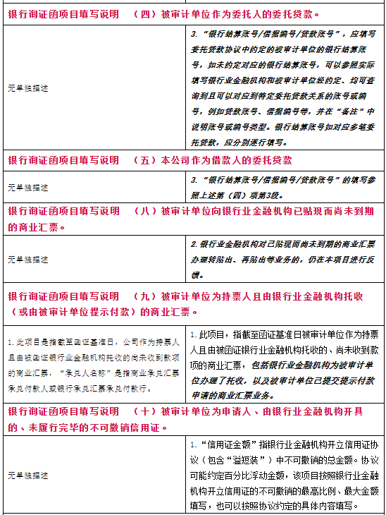 3.注册会计师应当对银行询证函中列示的1—14项信息及附表,按照实际情况以及上述第1条和第2条的要求填写相应信息,不应留白。针对“备注”栏,如果不存在按照本指引需要列示说明的信息,应当填写“无”;如果存在注册会计师或被审计单位认为需要额外说明的信息,可以填写在第14项“其他”。如果银行业金融机构收到存在空白内容的询证函,银行业金融机构可以退函处理。