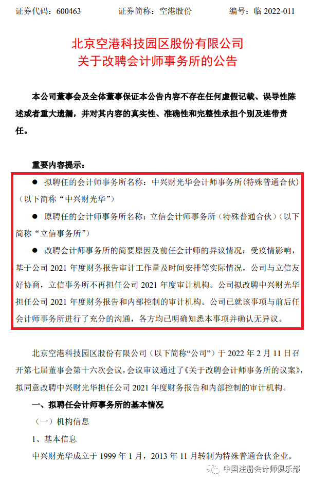 空港股份于2月12日发布的《关于改聘会计师事务所的公告》显示,立信事务所项目组成员在京外项目审计过程中,签字注册会计师以及项目组主要成员因疫情原因进行隔离。其中项目组主要成员在西安和南京进行隔离,签字注册会计师因曾去往深圳出差,恰逢深圳发生疫情,无法返京。因此签字注册会计师和项目组主要成员无法亲临现场进行审计,公司要求立信事务所重新指派项目负责人或派入经验更丰富的成员,但立信事务所成员均在外省进行外勤审计。受京外疫情影响,返京政策收紧,且立信事务所目前在京未被隔离团队无可调配人力资源等原因,立信事务所预计无法完成审计工作,立信事务所提出辞任公司2021年度审计机构。公司拟改聘中兴财光华担任公司2021年度财务报告和内部控制的审计机构。本期审计收费95万元,其中年报审计收费65万元,内控审计30万元。