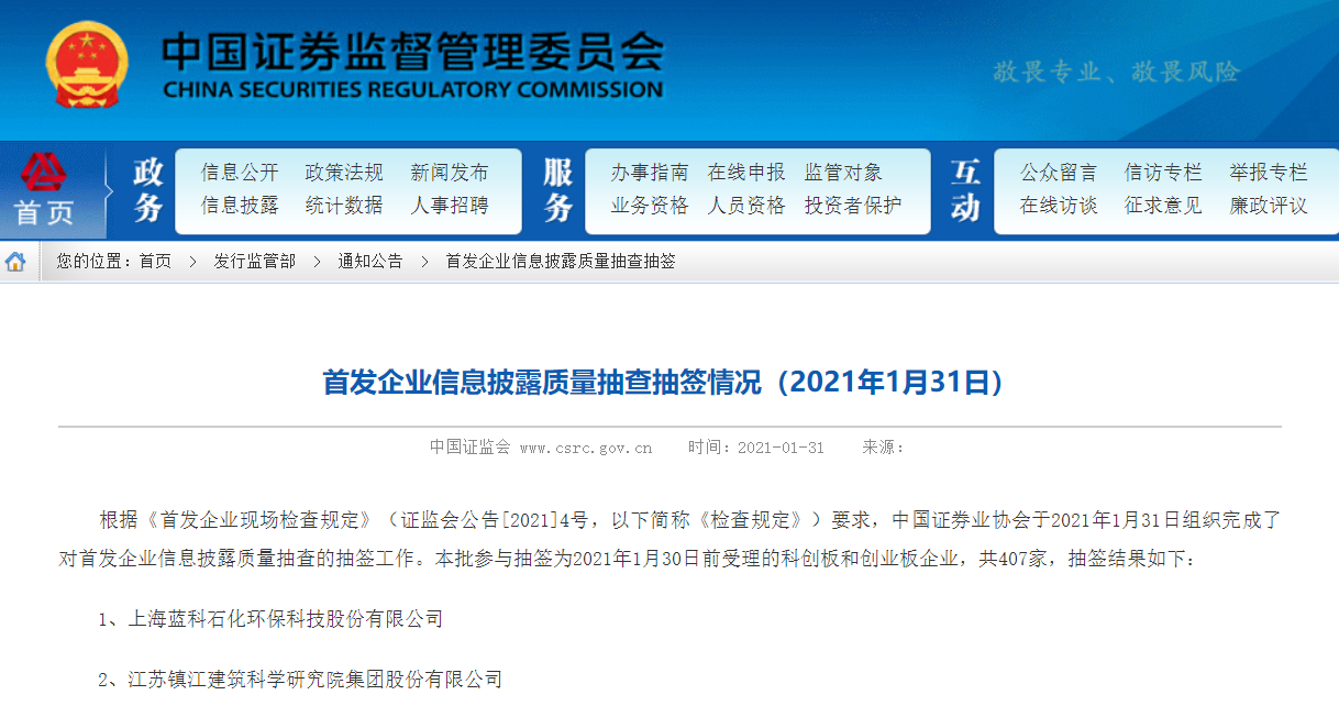 首发企业信息披露质量抽查抽签情况(2021年1月31日)