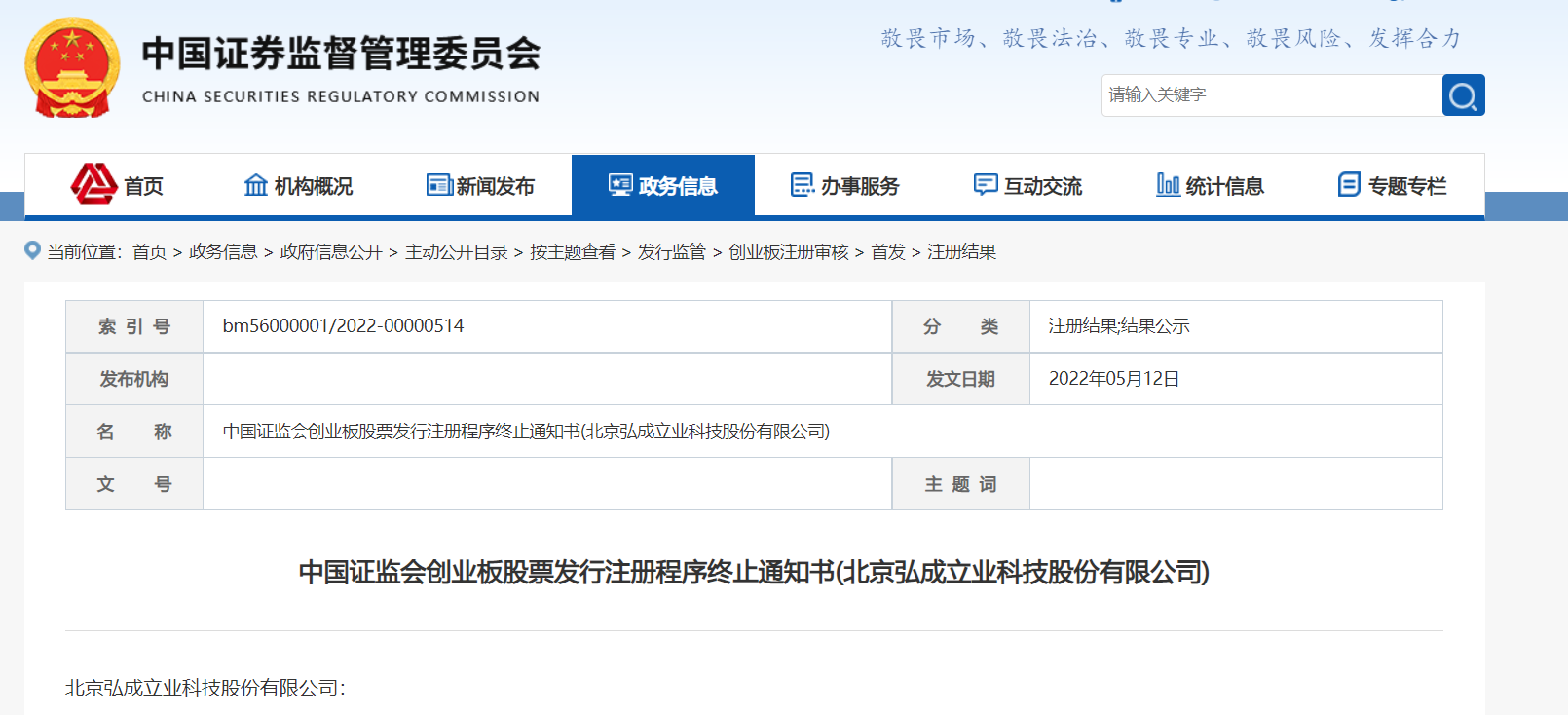 2022年4月29日,你公司和保荐机构中信建投证券股份有限公司提交了《北京弘成立业科技股份有限公司关于撤回首次公开发行股票并在创业板上市申请文件的申请》和《中信建投证券股份有限公司关于撤回北京弘成立业科技股份有限公司首次公开发行项目并在创业板上市申请文件的申请》(中建证发[2022]525号),主动要求撤回注册申请文件。