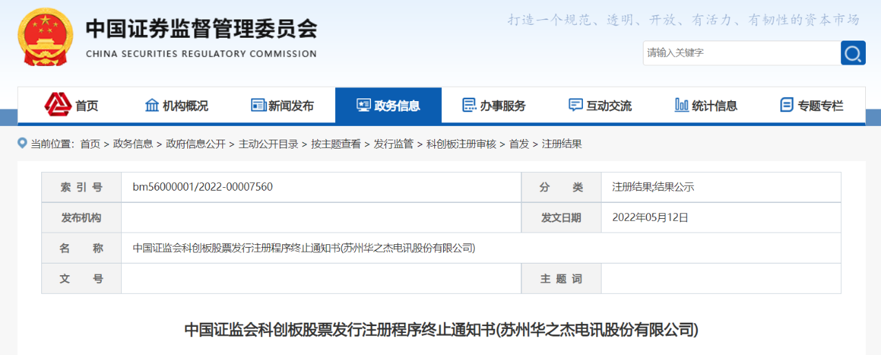 中国证监会科创板股票发行注册程序终止通知书(苏州华之杰电讯股份有限公司)