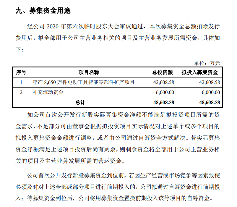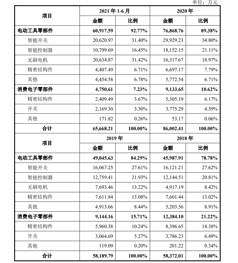 招股说明书显示,公司定位于智能控制行业,是一家致力于为电动工具、消费电子等领域产品提供智能、安全、精密的关键功能零部件的供应商,公司主要产品包括电动工具的智能开关、智能控制器、无刷电机及精密结构件等,以及消费电子的精密结构件、开关等。