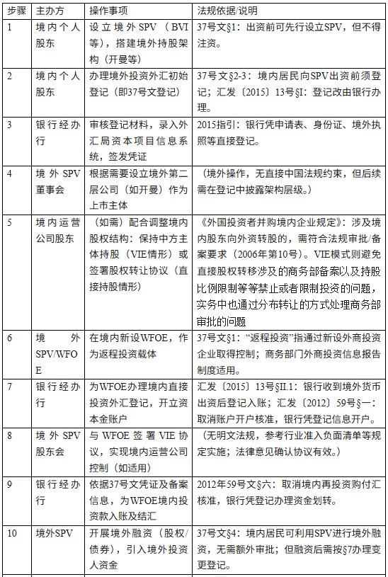 下表按时间顺序列出了境内居民红筹路径各步骤的操作要点、责任主体、办理内容及主要法规依据,供拟上市企业及其顾问参考: