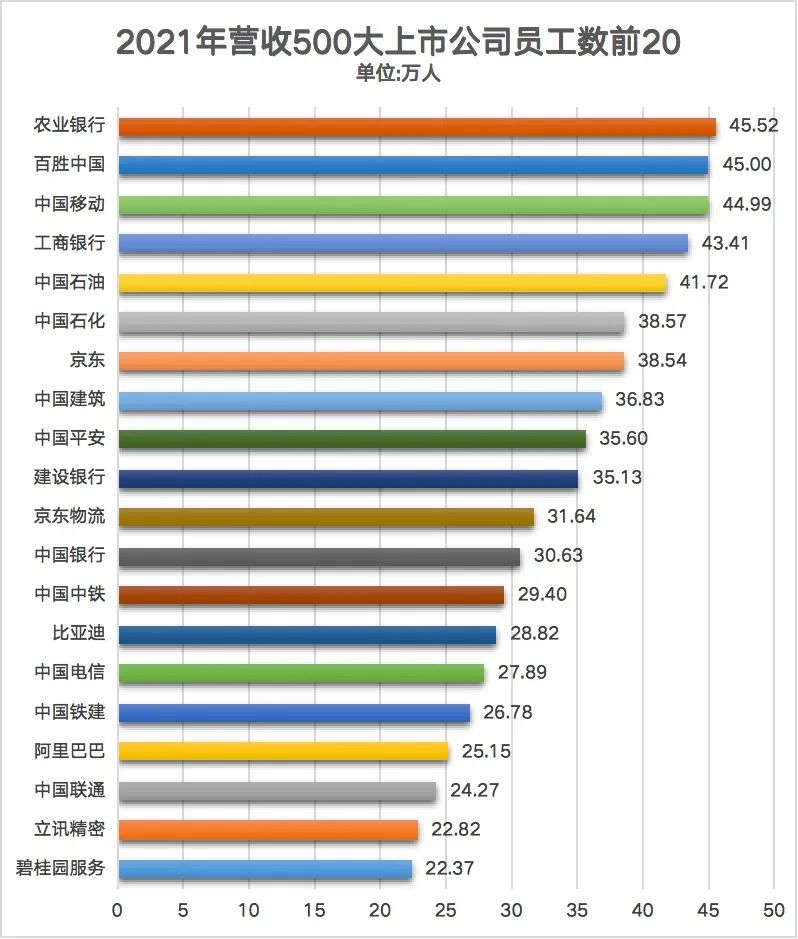 农业银行拥有员工最多,高达45.52万人;百胜中国紧随其后,拥有员工数45万人(包括兼职餐厅服务组成员)。中国移动、工商银行和中国石油3家拥有员工数也超过40万,分别为44.99万人、43.41万人和41.72万人。