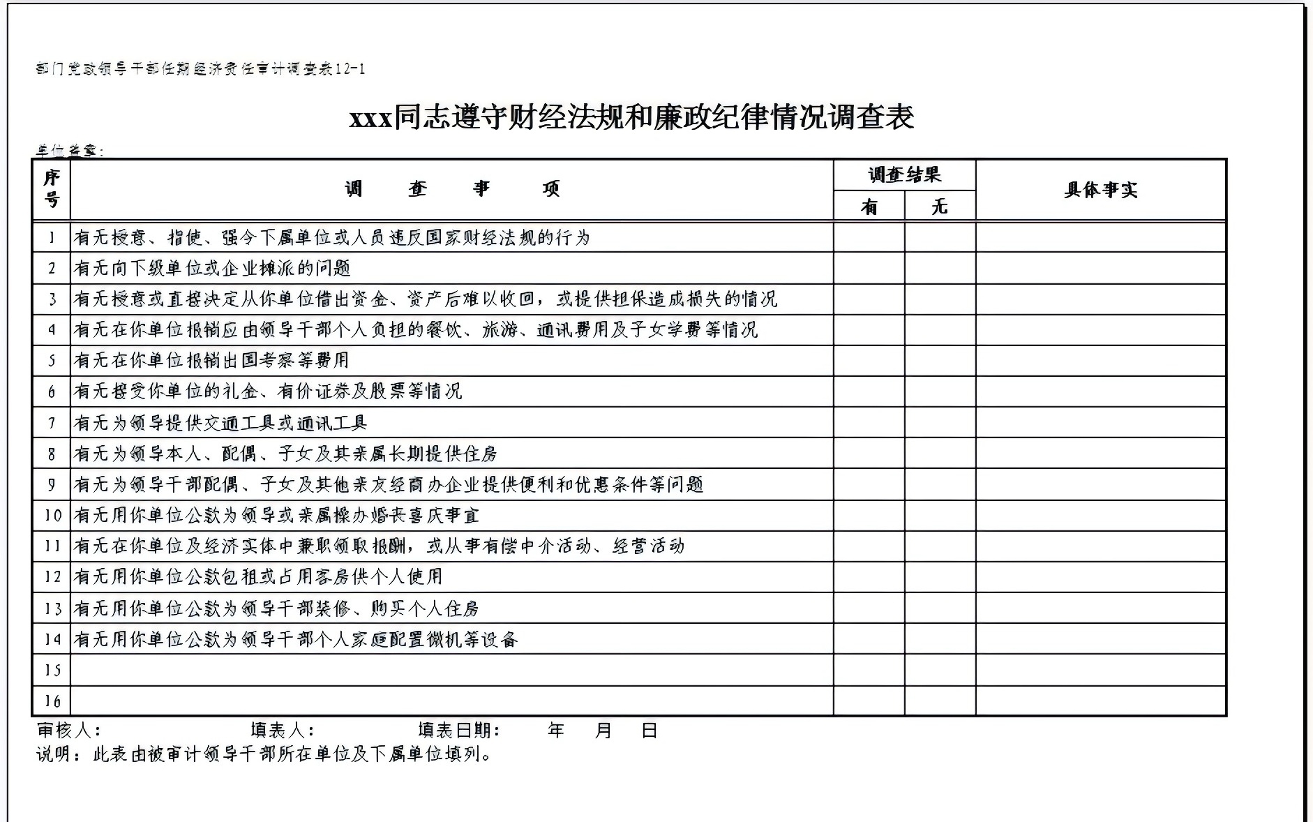 5.被审计领导干部遵守国家财经法规和相关廉政规定的情况。主要核实被审计领导干部本人在财政、财务收支、基本建设等重大经济活动中,有无侵占国有资产等违反国家财经法纪的行为,以及在公务活动中遵守相关廉政规定情况等。6.其它需要审计查证的事项。包括纪检、监察机关提供的相关线索及群众反映的与财政财务相关的重大事项等。